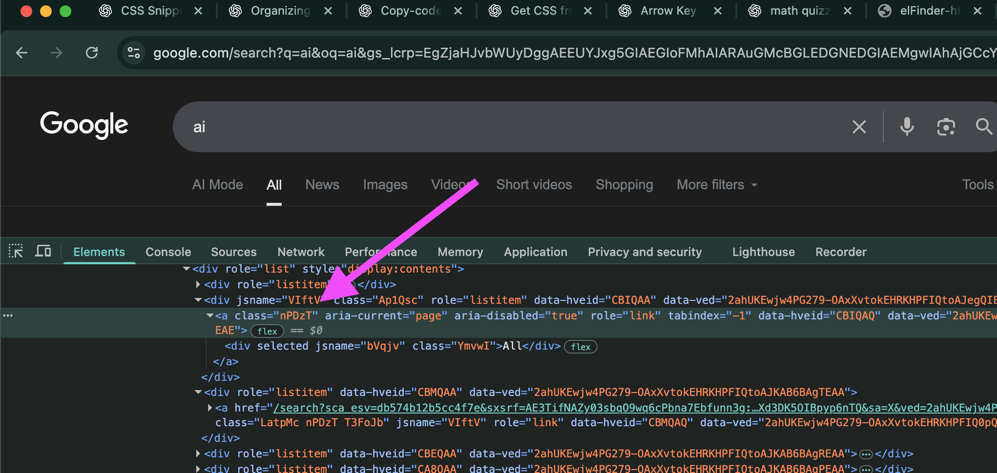 <a class="C6AK7c" aria-disabled="true" role="link" tabindex="0" data-hveid="CA8QAQ" data-ved="2ahUKEwjE4ey7xOKOAxWsFlkFHZlyNLIQ2Z0MegQIDxAB"><div jsname="xBNgKe" aria-current="page" selected="" class="mXwfNd"><span class="R1QWuf">All</span></div></a>